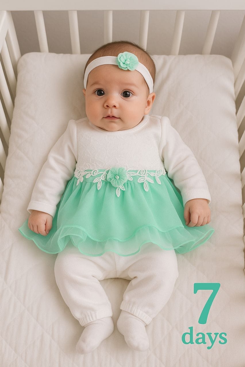اجعلي يوم سبوع طفلتك أو مناسبة استقبالها لا يُنسى مع هذا الطقم الأنيق والكامل المصمم خصيصًا لراحة ونعومة المواليد الجدد. هذا الطقم يجمع بين أناقة فستان الاستقبال ودفء وراحة الملابس القطنية الداخلية. إنه الخيار الأمثل لإطلالة الأميرات الصغيرات!